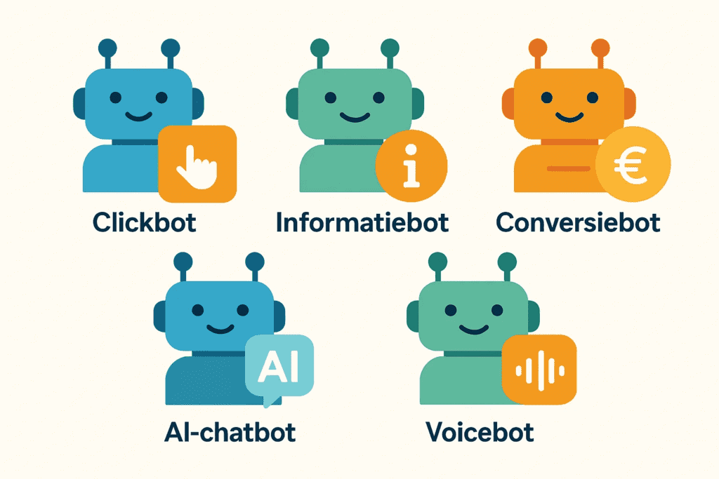 De soorten chatbots die bedrijven inzetten, verschillen sterk per branche, doelgroep en doelstelling. Elk type heeft zijn eigen kracht en toepassingsgebied. Hieronder lichten we de belangrijkste varianten uit met een korte toelichting: